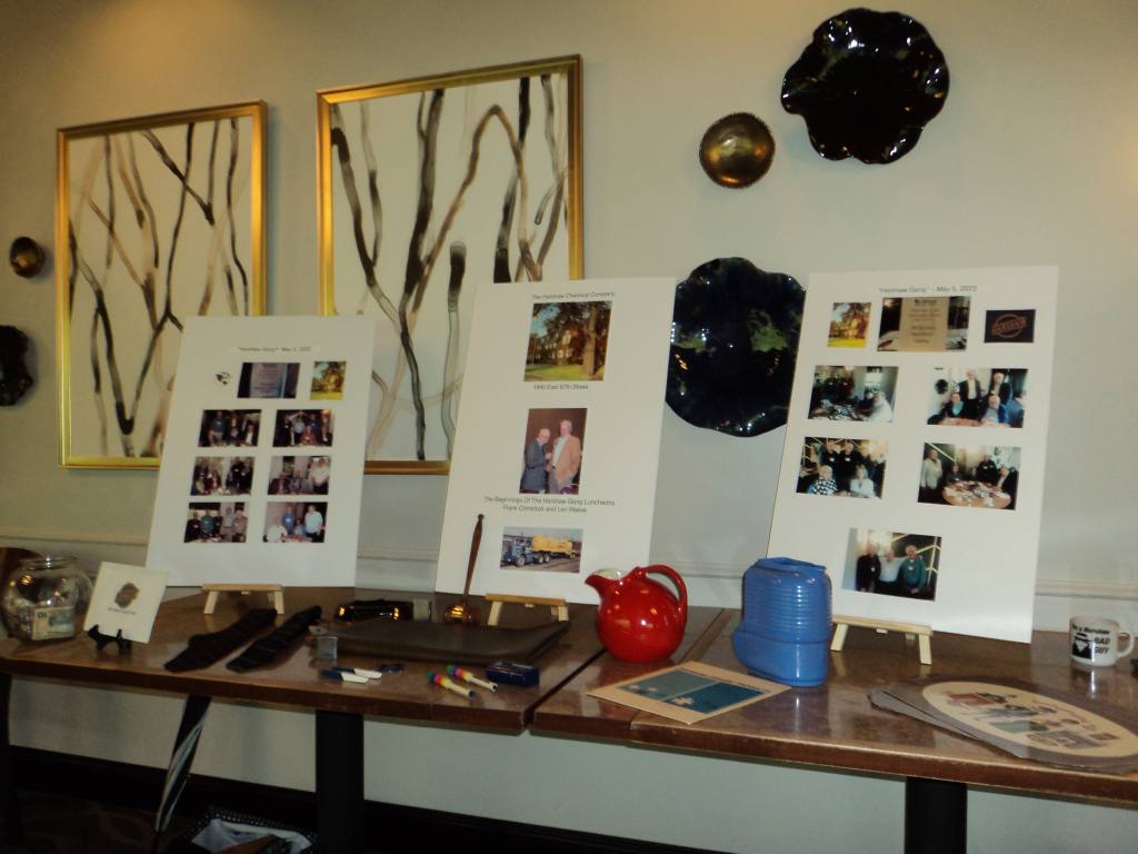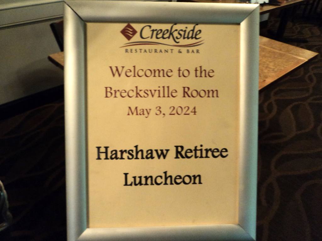 Standing: Jim Pinchot, Richard Olechnowicz | | Display table with pictures of recent luncheon attendees, former Harshaw Gang leaders and Ceramic color product items used for a show and tell by Tim Harteis and Bill Loucka | |  | | | | | | Welcome sign by the entrance to the private dinng room at the Creekside Restaurant and Bar | | | | | |